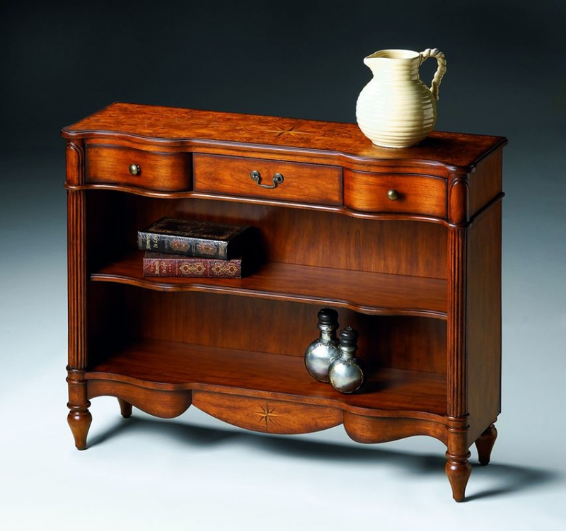 Selected solid woods and choice cherry and olive ash burl veneers. Maple, walnut and cherry veneer inlay on top and bottom front apron. Three drawers with antique brass finished hardware.