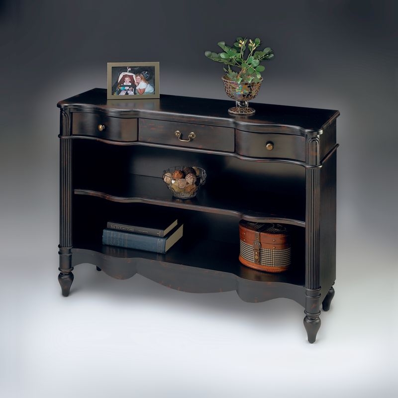 Lightly textured hand painted finish on selected hardwoods and cherry veneers. Three drawers with antique brass finished hardware.