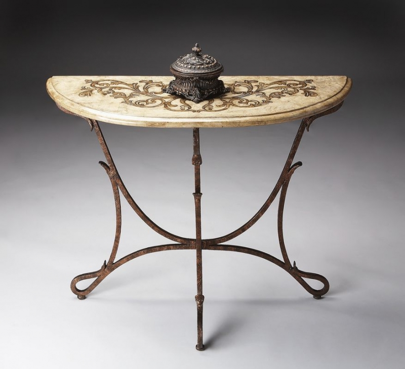 This demilune console has a bronze finished metal base with an acid-etched pastor stone top.