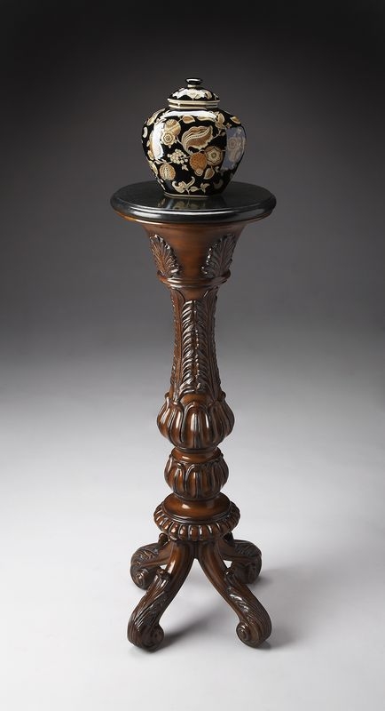 Perfect for displaying a beautiful vase, plant or floral arrangement, this elegant traditional pedestal is a wonderful finishing touch to virtually any space. Hand carved details, including acanthus leaves, adorn the base on up to the black fossil stone veneer top. Cast resin base and wood products.