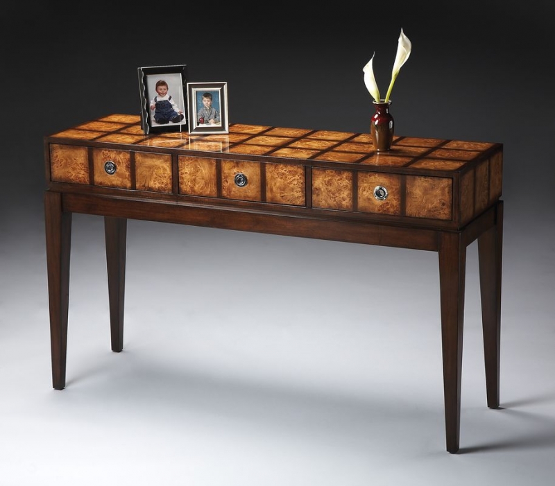 Selected solid woods, wood products and choice veneers. Myrtle cluster veneer design on top, sides and drawer fronts separated by gemelina solid wood. Three drawers with silver finished hardware.
