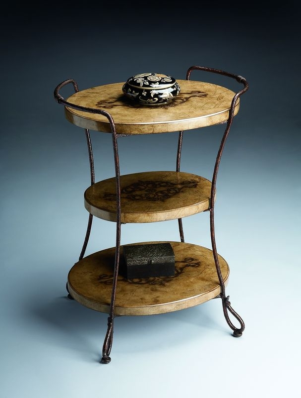 Wood products and finished metal. Fossil stone veneer with etched design on top and two shelves.