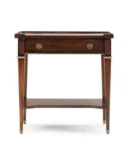 Side Table with brass ferrules and black stripping, one drawer, wood bottom shelf. 27 1/2 x 16 1/2 x 28H