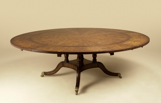 Aged Regency Style Expandable Dining Table, Crotch Veneer, Brass Accents.