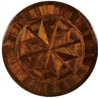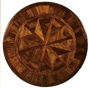 Rustic perimeter leaf table. Star pattern marquetry inlaid top of alternating Mahogany and select veneers with Mahogany solids Extends to 72" diameter with four removable perimeter leaves Dimensions Dia. 54" H. 30"
