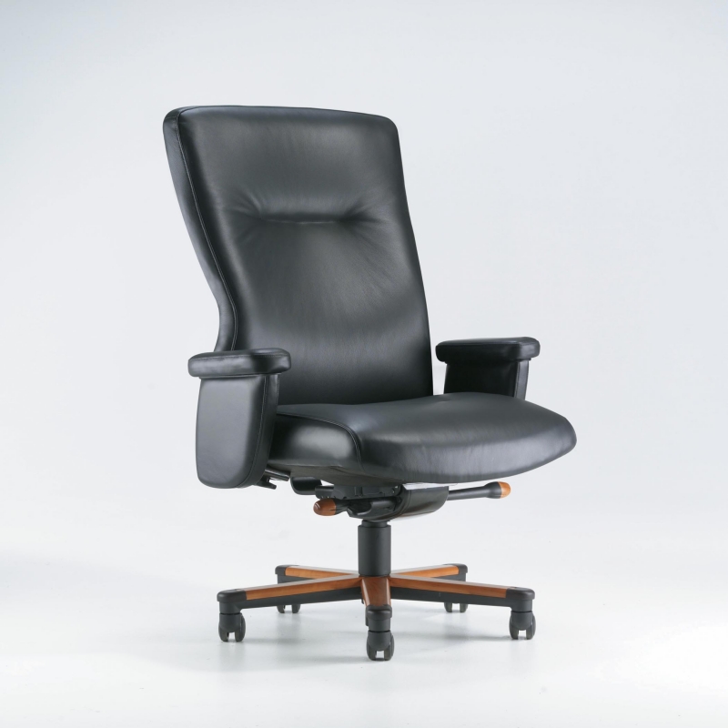 High back executive chair with adjustable back height and arms. Gas operated syncro-tilt 2:1 mechanism. Cherry wood, chrome, or black base. The un-task executive. OW 29 1/2 ID 21 OD 31 IH 25 OH 42 1/2 AH 25 1/2 WI 22 SH 19 1/2 - 23 1/2