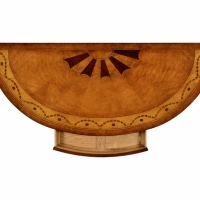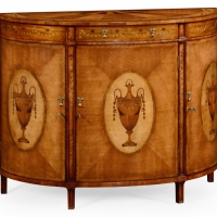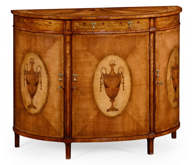 Adams style demilune cabinet with inlayed Grecian urns and floral swags in Walnut and Satinwood veneers. 48W x 28D x 37.75H