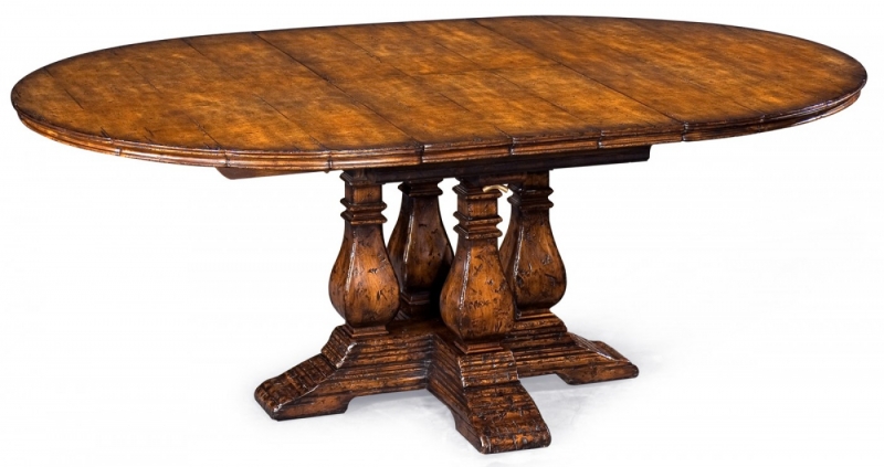 Country style round extending dining table in distressed antique figured walnut finish set on top of a group of clustered baluster supports. The top opens to reveal a self-storing leaf. Seats: 8 + 2.