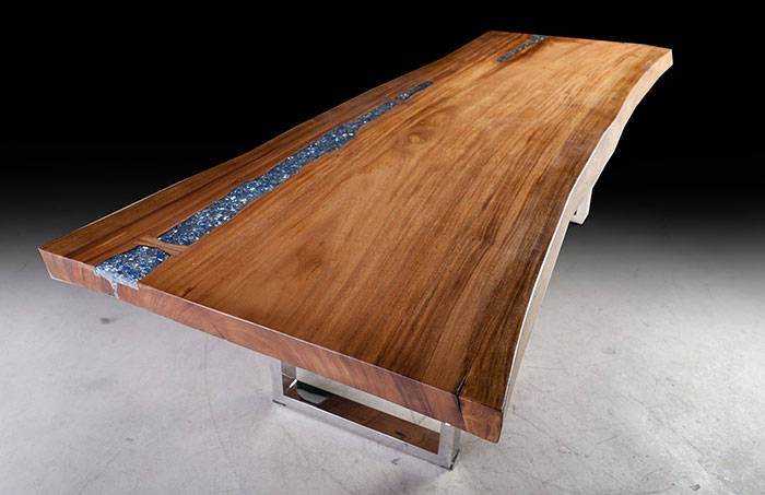The Jungle table is made with Monkey wood and recycled glass. The legs are stainless steel. Each piece is totally unique to the figure of the wood. Dimensions vary, please call for sizing.